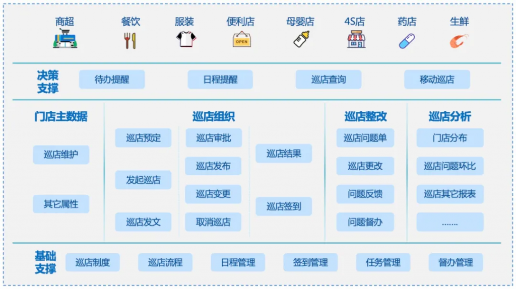 1、规范门店标准管理:通过规范门店基础资料、推动巡店业务标准化流程,统一制定巡店计划,推动工作效率提升。