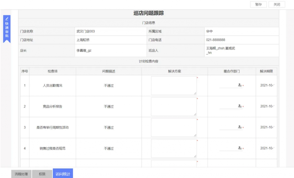 现场巡店过程中发现的问题,可在线提交问题跟踪单,要求店长跟进整改,整改完成后反馈确认,实现门店问题的整改闭环管理。