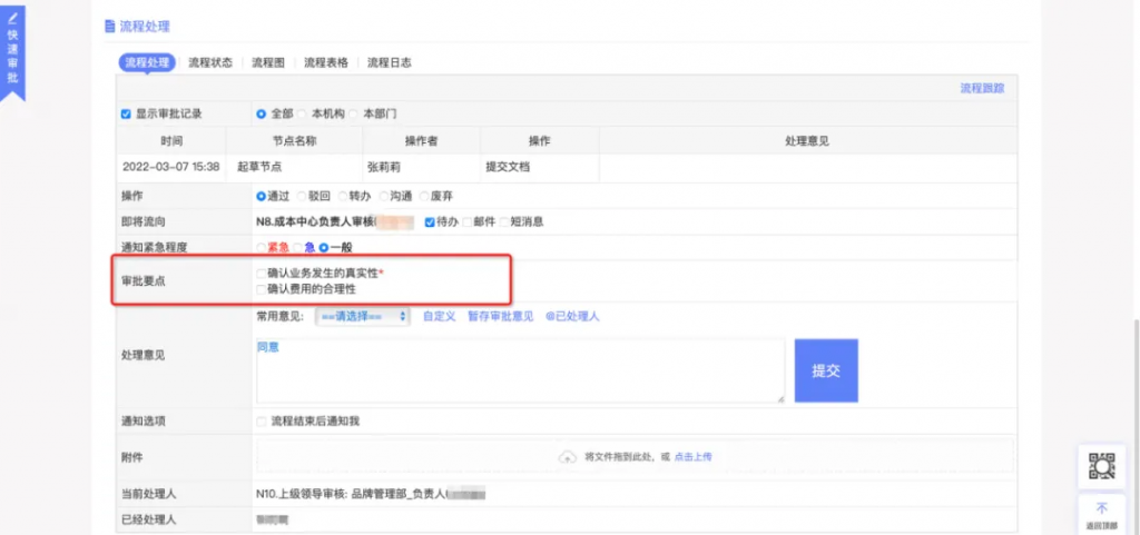 将流程与知识拉通,能让组织流程中嵌入各类知识,提示审批要点(如费用报销,提醒费用发生真实性及是否超额),用户勾选后才能审批通过,确保了流程的规范及审批的高效。