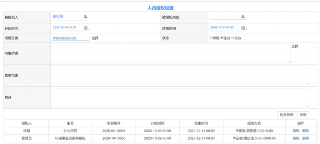 业务授权支撑领导人基于业务规则灵活分权,例如领导人将自己的采购审批权限,划分成不同的额度区间,让不同人来分享审批权限;
