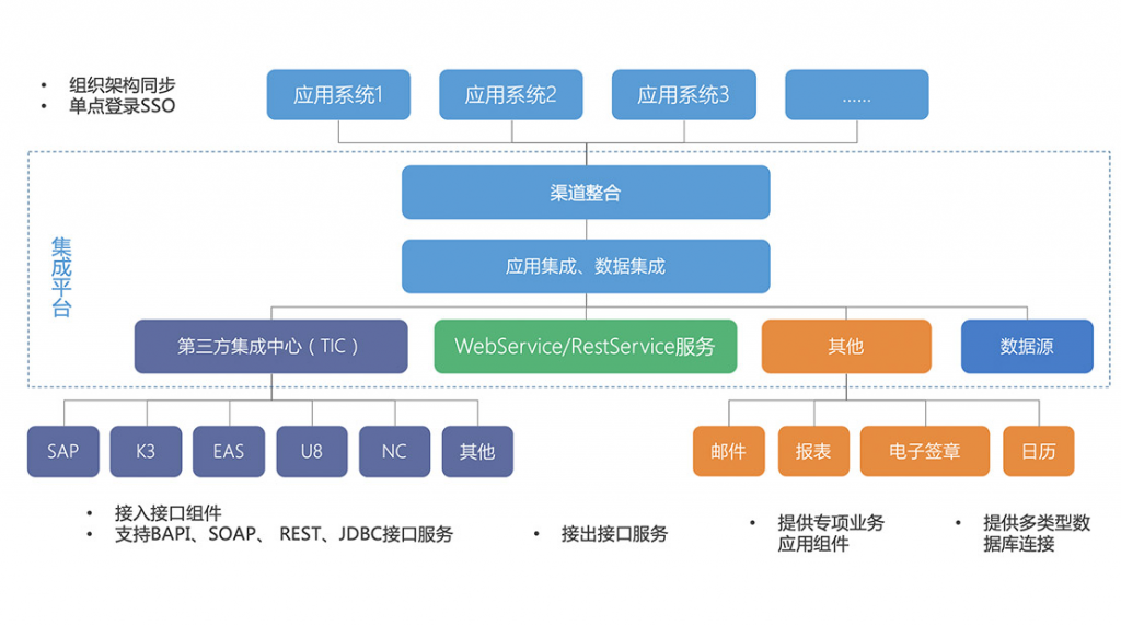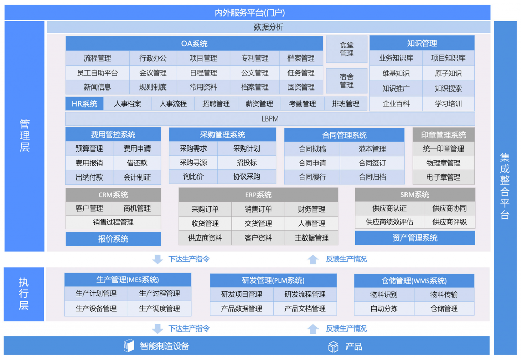 集成生产、制造、销售、财务、供应商管理、客户管理等各类系统,打破信息孤岛,实现数据互通;通过“集成平台+智能制造”模式为制造行业打造创新生态圈