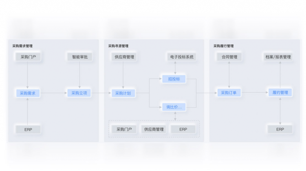 对采购业务进行从采购需求、计划、到采购寻源、采购执行的全流程管理;对供应商进行涵盖认证、准入、考核、评级的全过程管理
