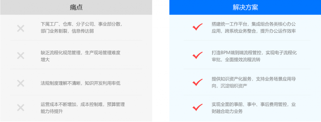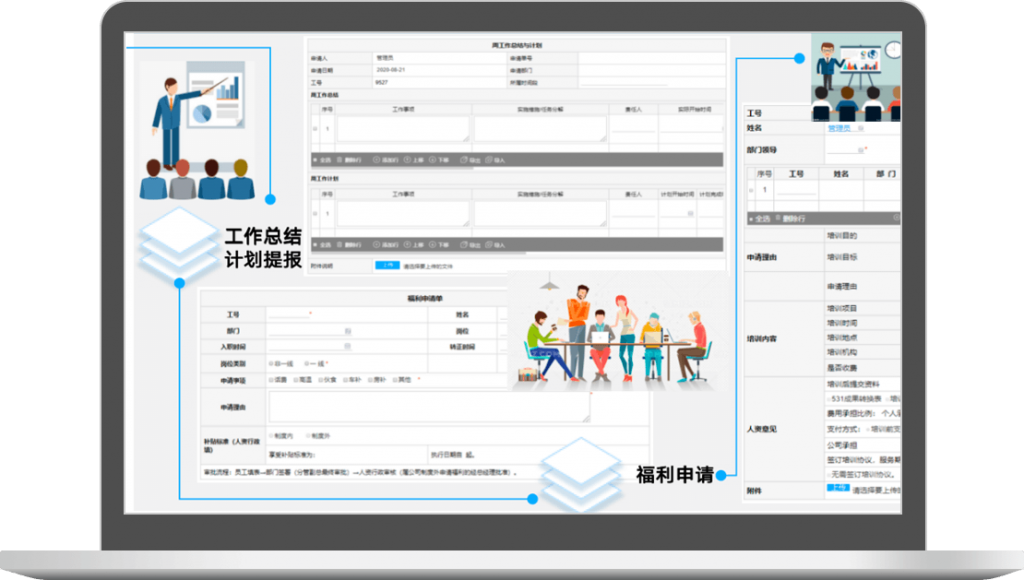 覆盖会议管理、日程管理、规范制度、车辆管理、固资管理、印章管理、任务管理、投票管理、问卷调查、员工活动、用品管理、证照管理等100+场景