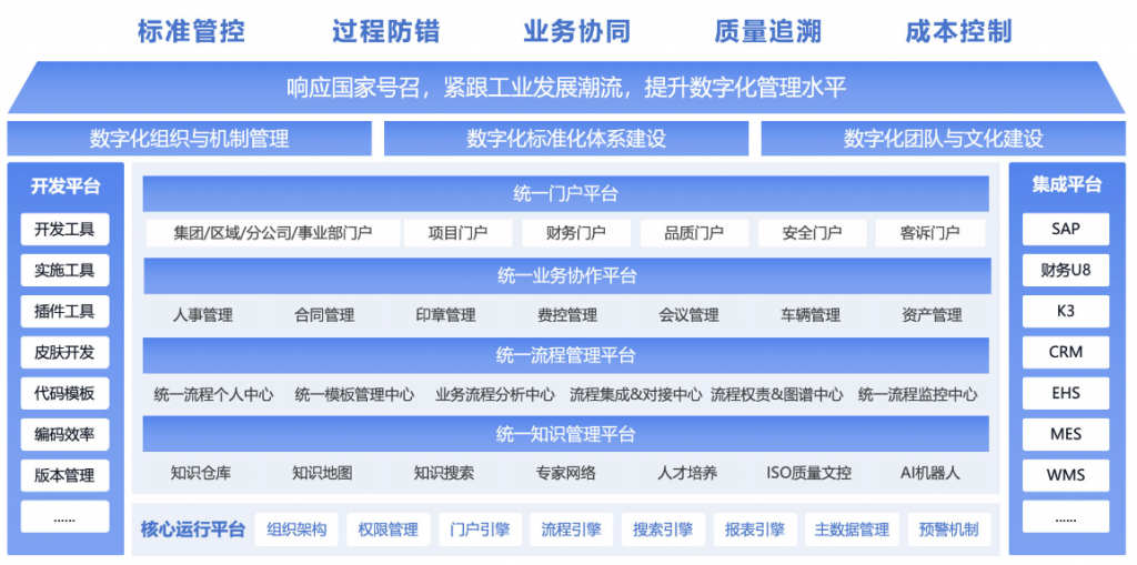 一次登录所有系统,统一消息、待办、新闻等,打造高层决策门户、企业生态门户、不同部门角色个性化门户等,权限精细化,做到管控、整合、赋能三位一体