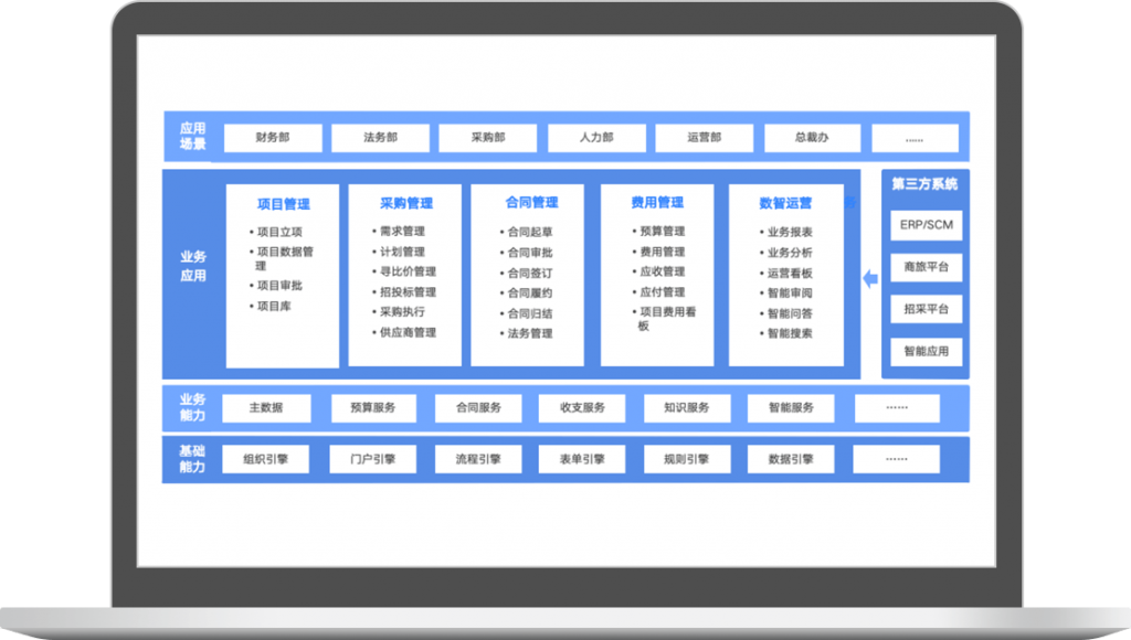 项目、采购、合同、报账等业财一体化融合,拉通权限业务协同更流畅,智能报销、合同起草、合同审批、法务管理等环节,并支持形成数据可视化报表